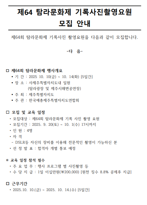 공지사항 제주예총 활동 소식을 만나 보세요. 제64회 탐라문화제 「기록사진촬영요원」 모집 안내 2025-09-19 09:16:36 작성자관리자 (manager) IP : 61.85.2.110 조회수217 +파일첨부 파일등록 업로드 용량은 최대 5M입니다. 파일선택 비밀번호 취소 닫기 첨부파일(1) 파일 로딩중 Facebook Twitter Kakaostory google 프린터 목록 수정 답글 삭제 게시물삭제 삭제하신 데이터는 복구가 불가능합니다. 게시물 제64회 탐라문화제 「기록사진촬영요원」 모집 안내 비밀번호 취소 닫기