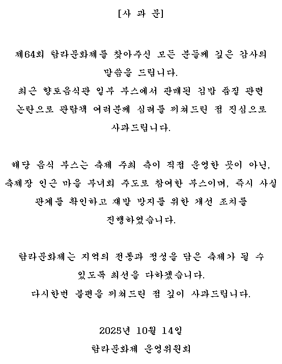 공지사항 제주예총 활동 소식을 만나 보세요. 향토음식점 관련 사과문 2025-10-14 10:12:46 작성자관리자 (manager) IP : 121.189.106.33 조회수104 +파일첨부 파일등록 업로드 용량은 최대 5M입니다. 파일선택 비밀번호 취소 닫기 첨부파일(1) 파일 로딩중 Facebook Twitter Kakaostory google 프린터 목록 수정 삭제 게시물삭제 삭제하신 데이터는 복구가 불가능합니다. 게시물 향토음식점 관련 사과문 비밀번호 취소 닫기