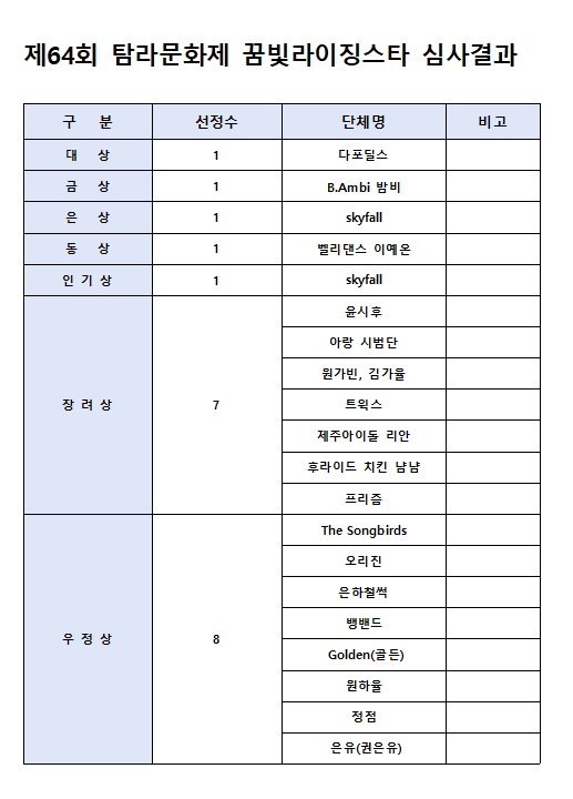 공지사항 제주예총 활동 소식을 만나 보세요. 제64회 탐라문화제 꿈빛라이징스타 결과 안내 2025-10-27 06:44:27 작성자관리자 (manager) IP : 61.85.2.110 조회수65 +파일첨부 파일등록 업로드 용량은 최대 5M입니다. 파일선택 비밀번호 취소 닫기 첨부파일(1) 파일 로딩중 Facebook Twitter Kakaostory google 프린터 목록 수정 삭제 게시물삭제 삭제하신 데이터는 복구가 불가능합니다. 게시물 제64회 탐라문화제 꿈빛라이징스타 결과 안내 비밀번호 취소 닫기