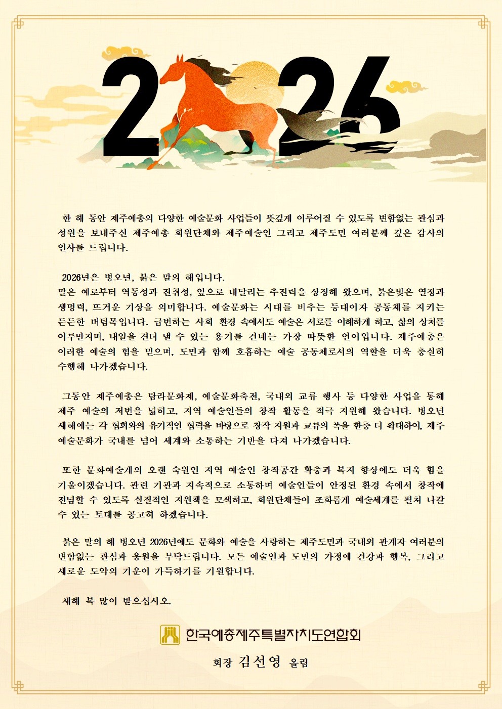 공지사항 제주예총 활동 소식을 만나 보세요. 2026년 제주예총 신년사 2025-12-30 08:39:06 작성자관리자 (manager) IP : 61.85.2.110 조회수53 +파일첨부 파일등록 업로드 용량은 최대 5M입니다. 파일선택 비밀번호 취소 닫기 Facebook Twitter Kakaostory google 프린터 목록 수정 답글 삭제 게시물삭제 삭제하신 데이터는 복구가 불가능합니다. 게시물 2026년 제주예총 신년사 비밀번호 취소 닫기