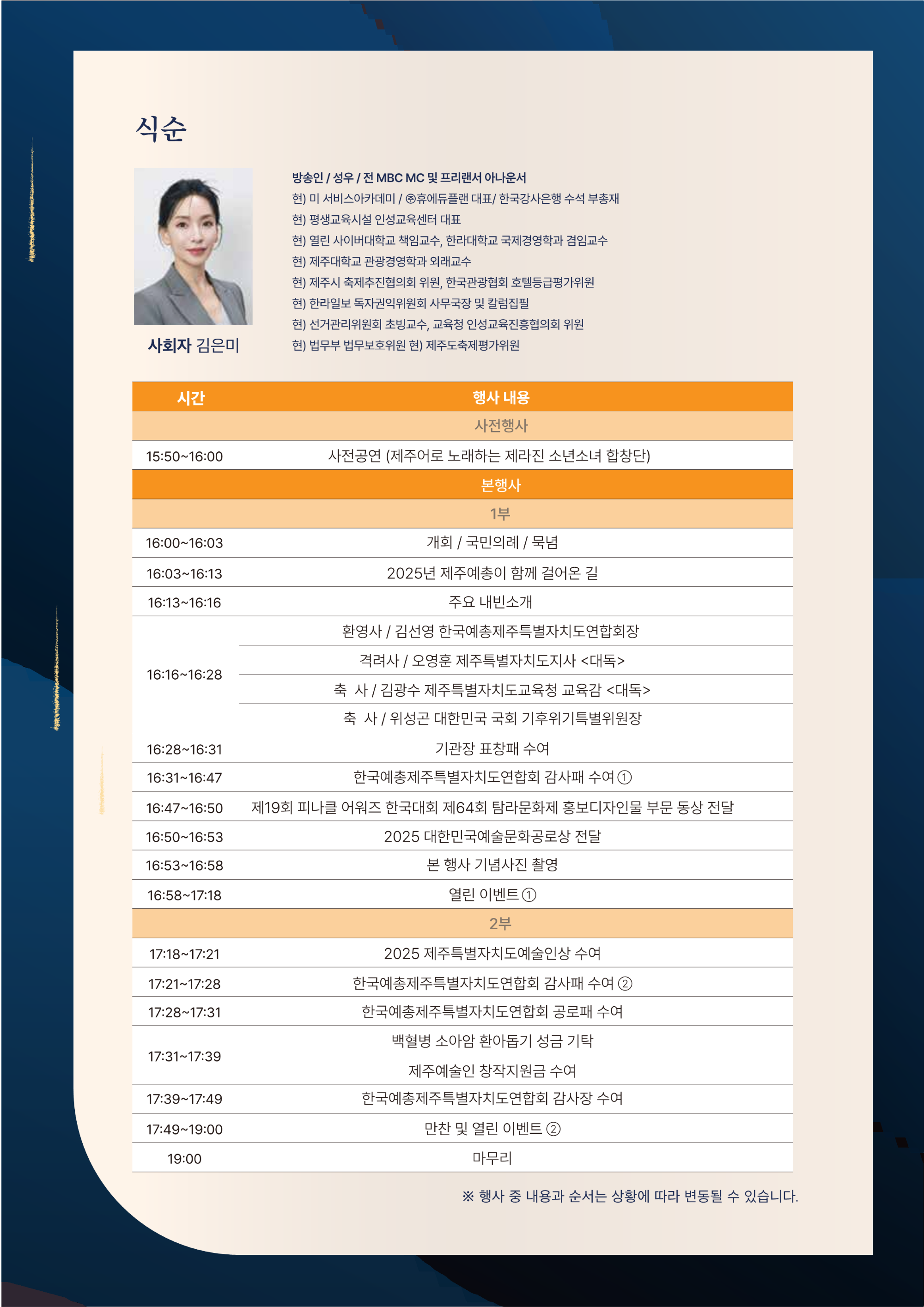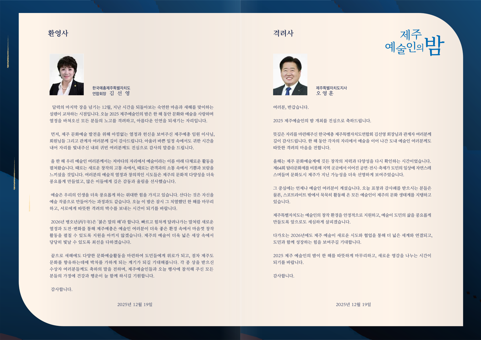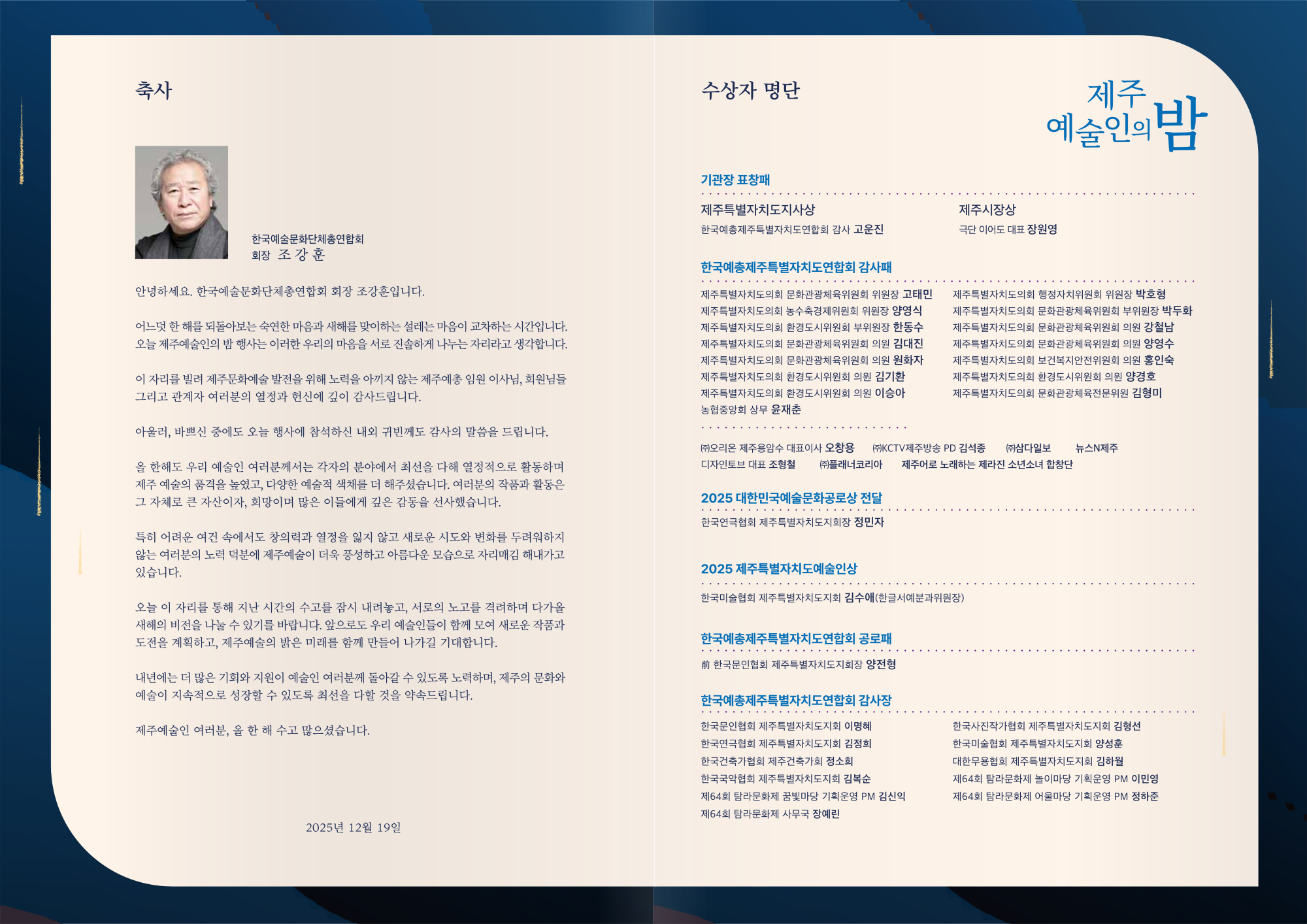공지사항 제주예총 활동 소식을 만나 보세요. 2025 제주예술인의밤 리플렛 2026-01-26 05:41:01 작성자관리자 (manager) IP : 61.85.2.110 조회수39 +파일첨부 파일등록 업로드 용량은 최대 5M입니다. 파일선택 비밀번호 취소 닫기 첨부파일(1) 파일 로딩중 Facebook Twitter Kakaostory google 프린터 목록 수정 답글 삭제 게시물삭제 삭제하신 데이터는 복구가 불가능합니다. 게시물 2025 제주예술인의밤 리플렛 비밀번호 취소 닫기