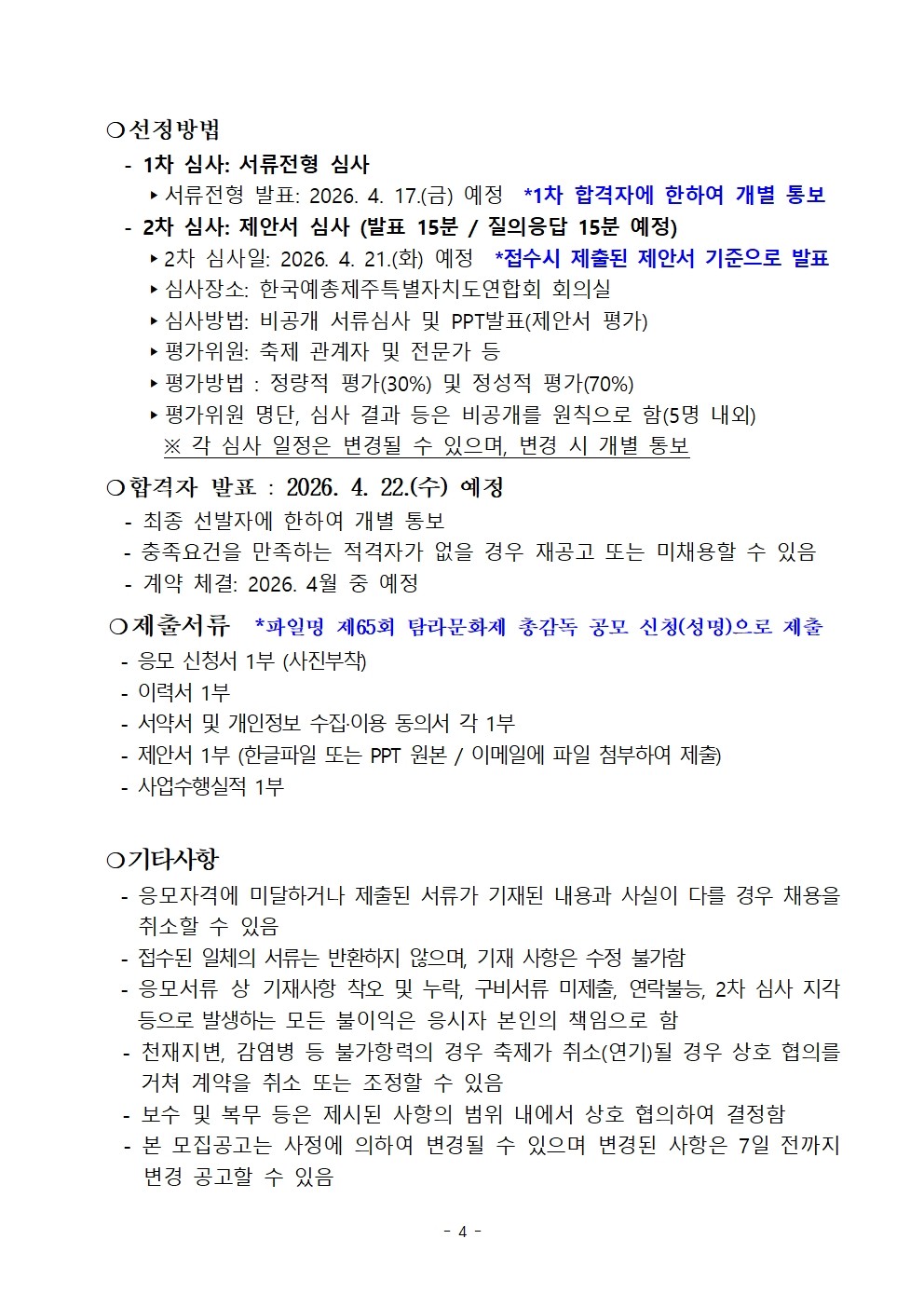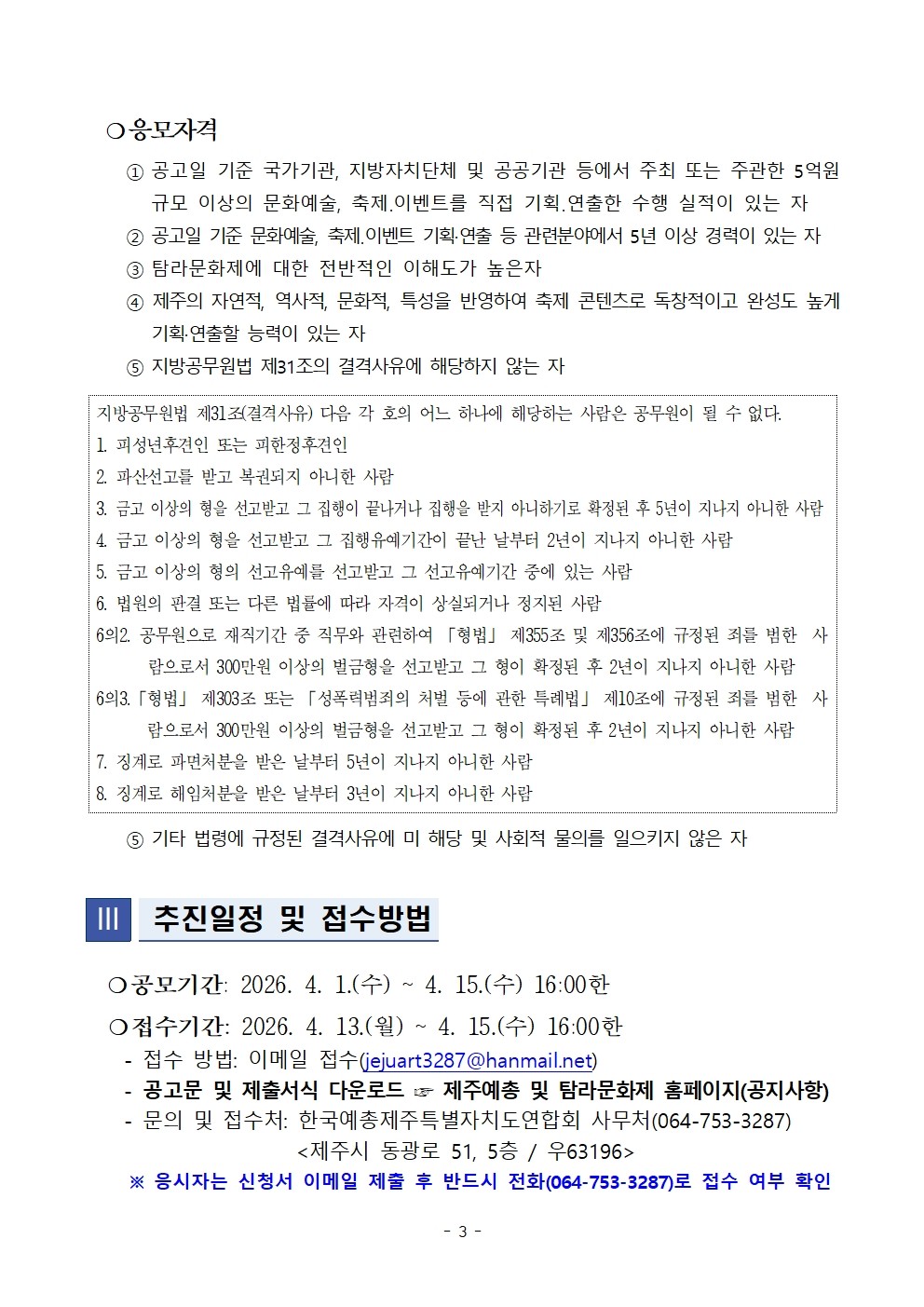 공지사항 제주예총 활동 소식을 만나 보세요. 제65회 탐라문화제 총감독 모집 공고 2026-03-27 08:42:15 작성자관리자 (manager) IP : 61.85.2.110 조회수122 +파일첨부 파일등록 업로드 용량은 최대 5M입니다. 파일선택 비밀번호 취소 닫기 첨부파일(1) 파일 로딩중 Facebook Twitter Kakaostory google 프린터 목록 수정 삭제 게시물삭제 삭제하신 데이터는 복구가 불가능합니다. 게시물 제65회 탐라문화제 총감독 모집 공고 비밀번호 취소 닫기
