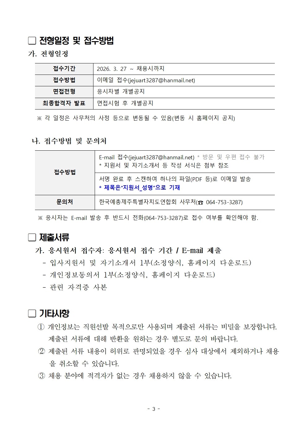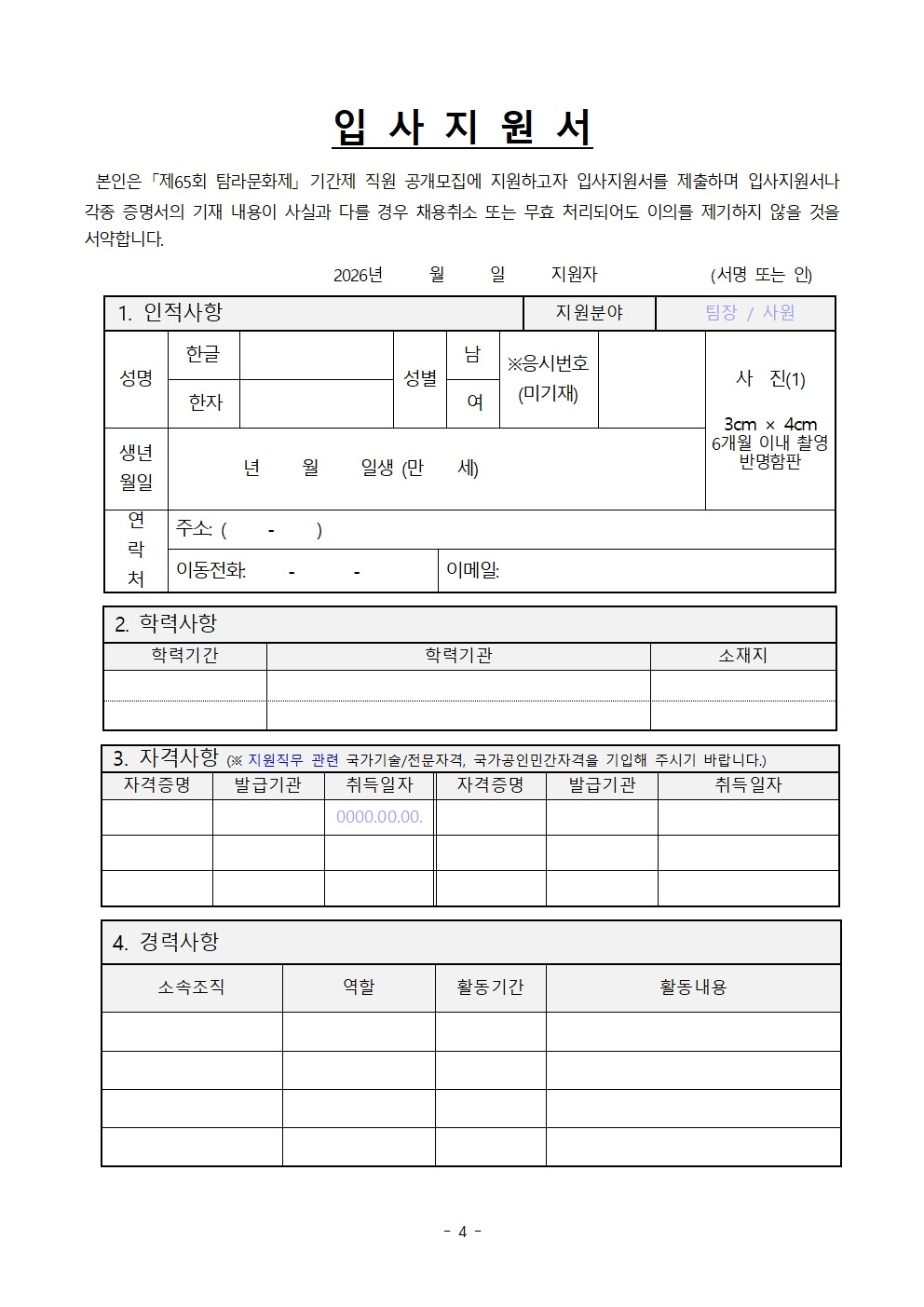 공지사항 제주예총 활동 소식을 만나 보세요. 제65회 탐라문화제 기간제 근로자 채용 공고 2026-03-27 08:43:53 작성자관리자 (manager) IP : 61.85.2.110 조회수180 +파일첨부 파일등록 업로드 용량은 최대 5M입니다. 파일선택 비밀번호 취소 닫기 첨부파일(1) 파일 로딩중 Facebook Twitter Kakaostory google 프린터 목록 수정 삭제 게시물삭제 삭제하신 데이터는 복구가 불가능합니다. 게시물 제65회 탐라문화제 기간제 근로자 채용 공고 비밀번호 취소 닫기