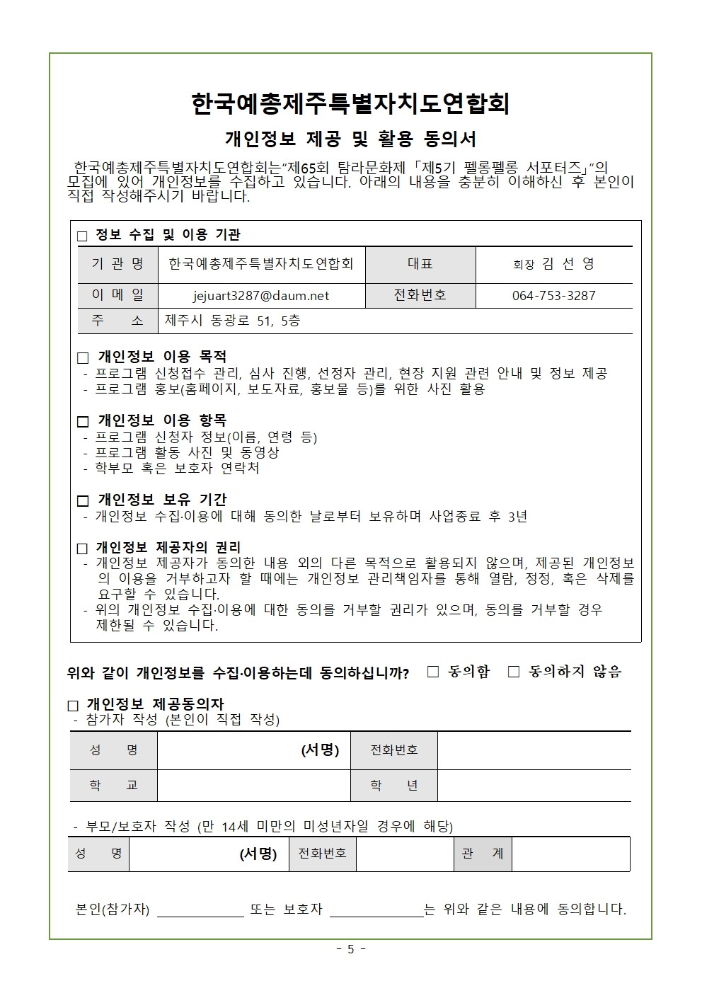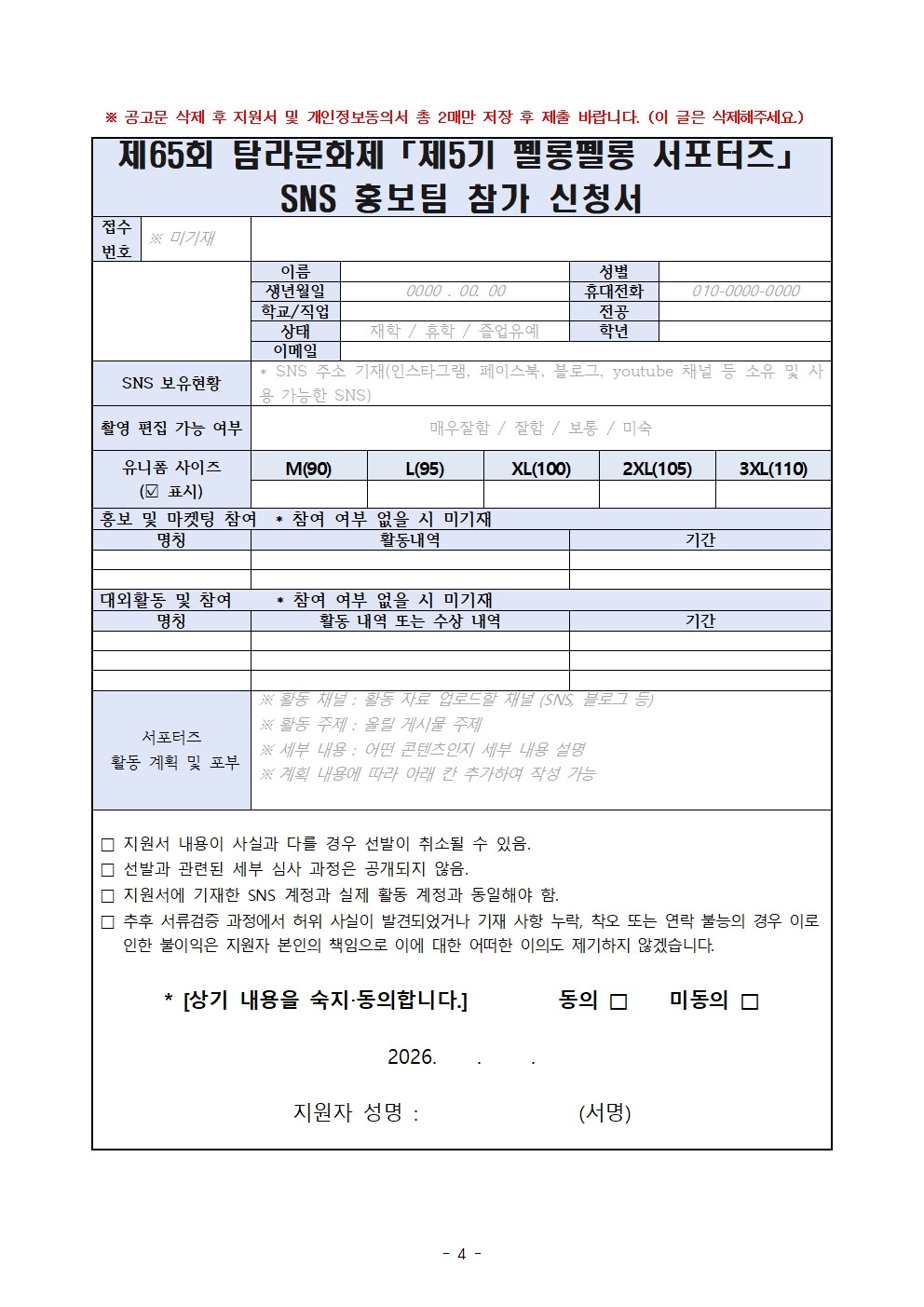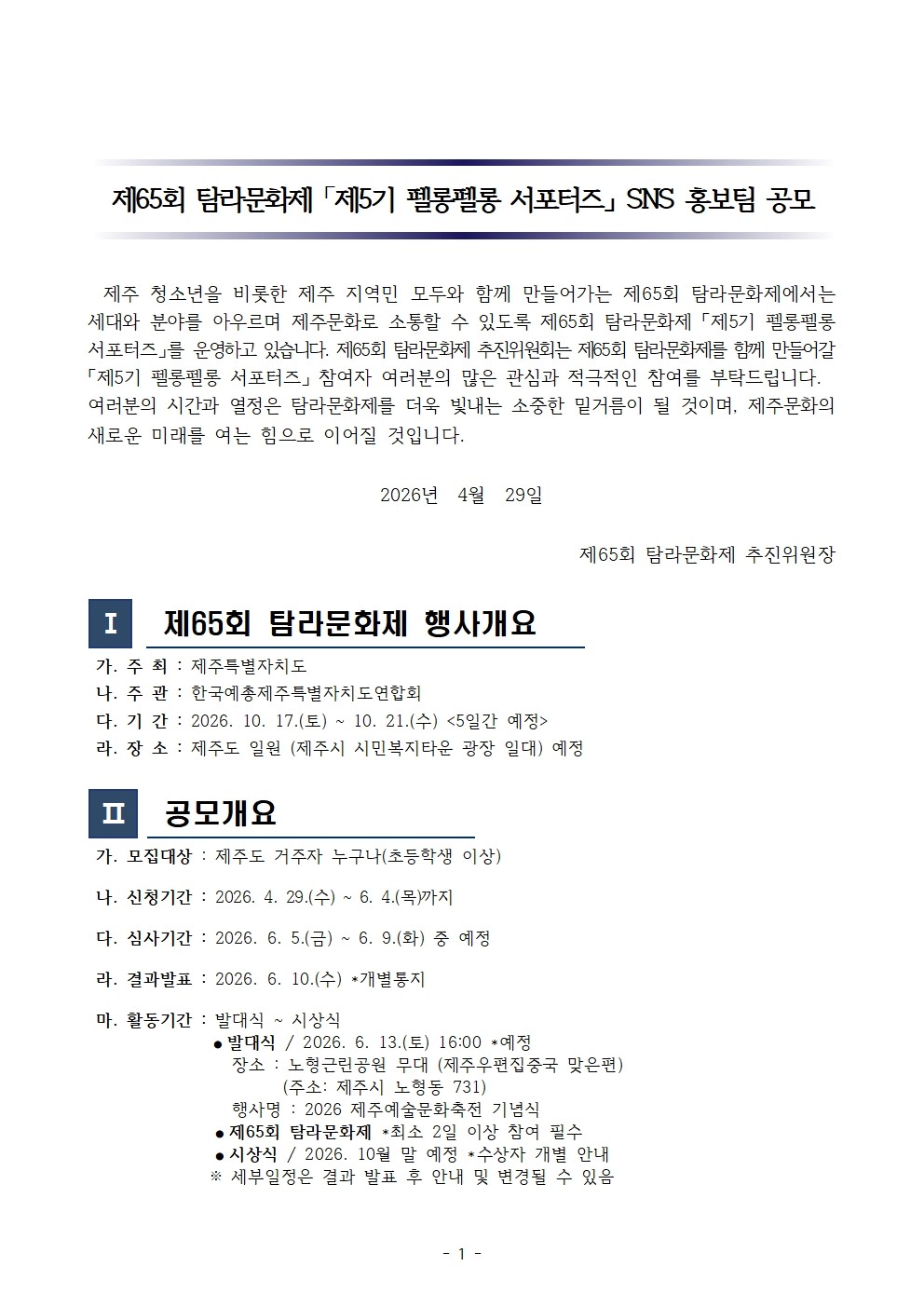 공지사항 제주예총 활동 소식을 만나 보세요. 제65회 탐라문화제 「제5기 펠롱펠롱 서포터즈」 SNS 홍보팀 공모 2026-04-29 07:22:24 작성자관리자 (manager) IP : 61.85.2.110 조회수62 +파일첨부 파일등록 업로드 용량은 최대 5M입니다. 파일선택 비밀번호 취소 닫기 첨부파일(1) 파일 로딩중 Facebook Twitter Kakaostory google 프린터 목록 수정 삭제 게시물삭제 삭제하신 데이터는 복구가 불가능합니다. 게시물 제65회 탐라문화제 「제5기 펠롱펠롱 서포터즈」 SNS 홍보팀 공모 비밀번호 취소 닫기