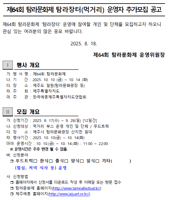 공지사항 제주예총 활동 소식을 만나 보세요. (추가공고) 제64회 탐라문화제 탐라장터(먹거리)운영자 모집 공고 2025-08-18 07:48:27 작성자관리자 (manager) IP : 61.85.2.110 조회수311 +파일첨부 파일등록 업로드 용량은 최대 5M입니다. 파일선택 비밀번호 취소 닫기 첨부파일(1) 파일 로딩중 Facebook Twitter Kakaostory google 프린터 목록 수정 답글 삭제 게시물삭제 삭제하신 데이터는 복구가 불가능합니다. 게시물 (추가공고) 제64회 탐라문화제 탐라장터(먹거리)운영자 모집 공고 비밀번호 취소 닫기