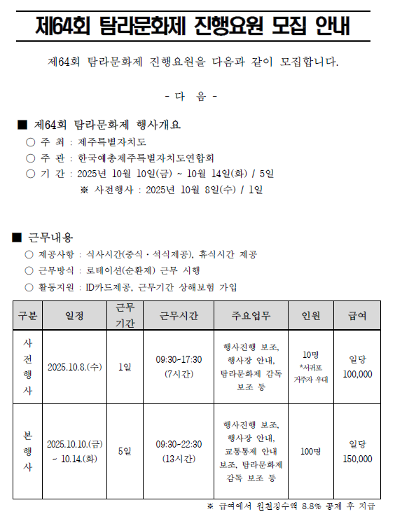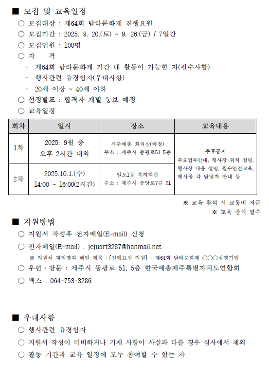 공지사항 제주예총 활동 소식을 만나 보세요. 제64회 탐라문화제 진행요원 모집공고 2025-08-19 07:24:53 작성자관리자 (manager) IP : 61.85.2.110 조회수584 +파일첨부 파일등록 업로드 용량은 최대 5M입니다. 파일선택 비밀번호 취소 닫기 첨부파일(1) 파일 로딩중 Facebook Twitter Kakaostory google 프린터 목록 수정 답글 삭제 게시물삭제 삭제하신 데이터는 복구가 불가능합니다. 게시물 제64회 탐라문화제 진행요원 모집공고 비밀번호 취소 닫기