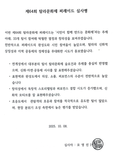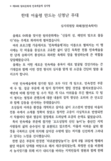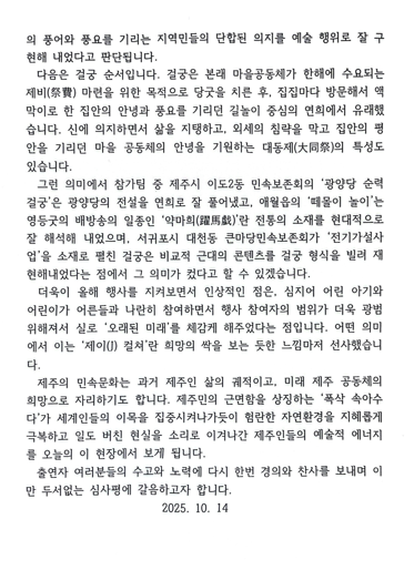 공지사항 제주예총 활동 소식을 만나 보세요. 제64회 탐라문화제 읍면동 경연별 심사평 2025-10-13 14:00:03 작성자관리자 (manager) IP : 211.235.96.119 조회수51 +파일첨부 파일등록 업로드 용량은 최대 5M입니다. 파일선택 비밀번호 취소 닫기 Facebook Twitter Kakaostory google 프린터 목록 수정 삭제 게시물삭제 삭제하신 데이터는 복구가 불가능합니다. 게시물 제64회 탐라문화제 읍면동 경연별 심사평 비밀번호 취소 닫기
