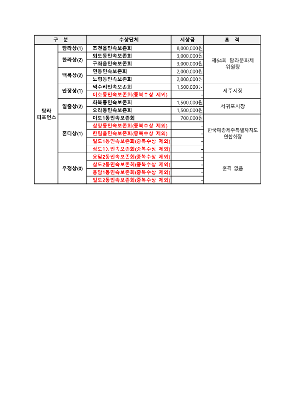 공지사항 제주예총 활동 소식을 만나 보세요. 제64회 탐라문화제, 탐라풍물제 경연별 심사결과(최종) 2025-10-14 03:37:43 작성자관리자 (manager) IP : 14.39.115.18 조회수69 +파일첨부 파일등록 업로드 용량은 최대 5M입니다. 파일선택 비밀번호 취소 닫기 첨부파일(1) 파일 로딩중 Facebook Twitter Kakaostory google 프린터 목록 수정 삭제 게시물삭제 삭제하신 데이터는 복구가 불가능합니다. 게시물 제64회 탐라문화제, 탐라풍물제 경연별 심사결과(최종) 비밀번호 취소 닫기