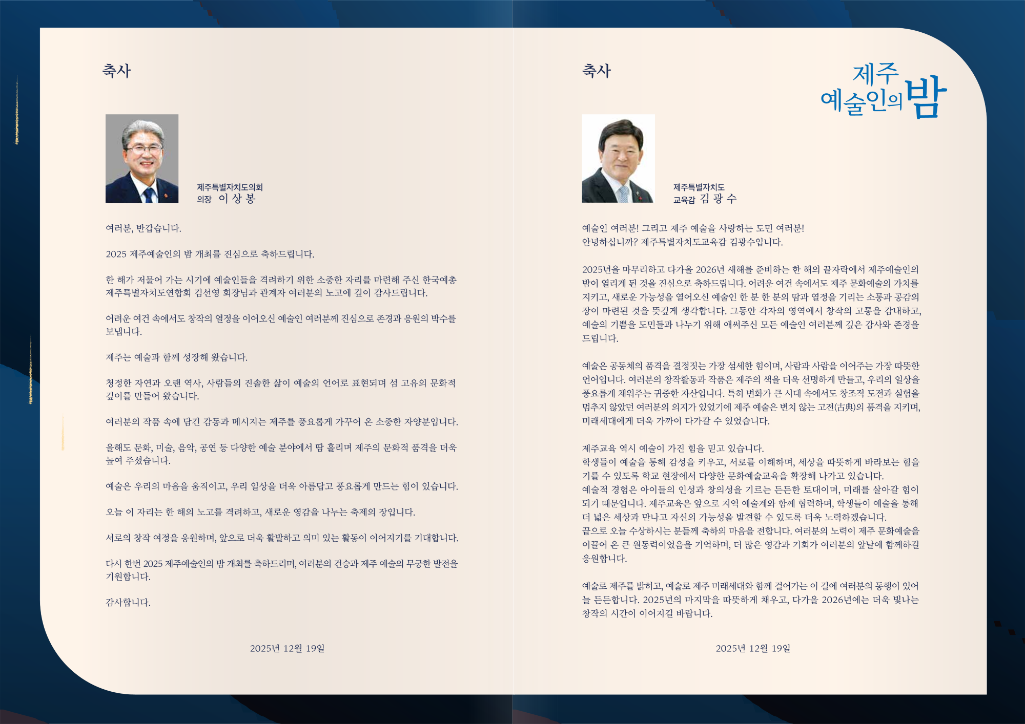 공지사항 제주예총 활동 소식을 만나 보세요. 2025 제주예술인의밤 리플렛 2026-01-26 05:41:01 작성자관리자 (manager) IP : 61.85.2.110 조회수40 +파일첨부 파일등록 업로드 용량은 최대 5M입니다. 파일선택 비밀번호 취소 닫기 첨부파일(1) 파일 로딩중 Facebook Twitter Kakaostory google 프린터 목록 수정 답글 삭제 게시물삭제 삭제하신 데이터는 복구가 불가능합니다. 게시물 2025 제주예술인의밤 리플렛 비밀번호 취소 닫기