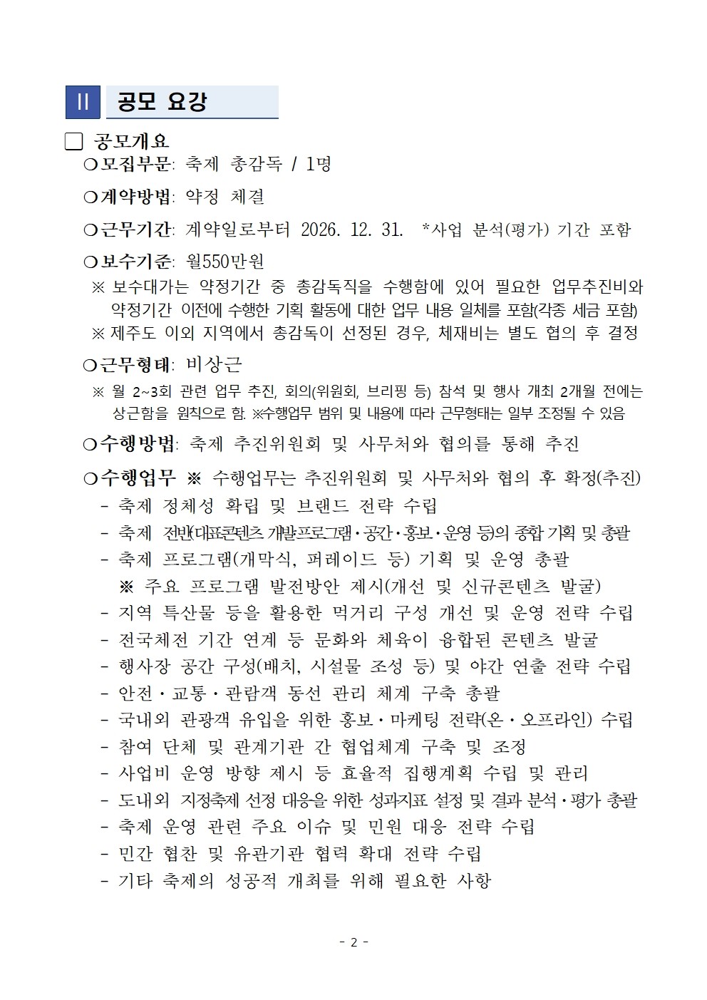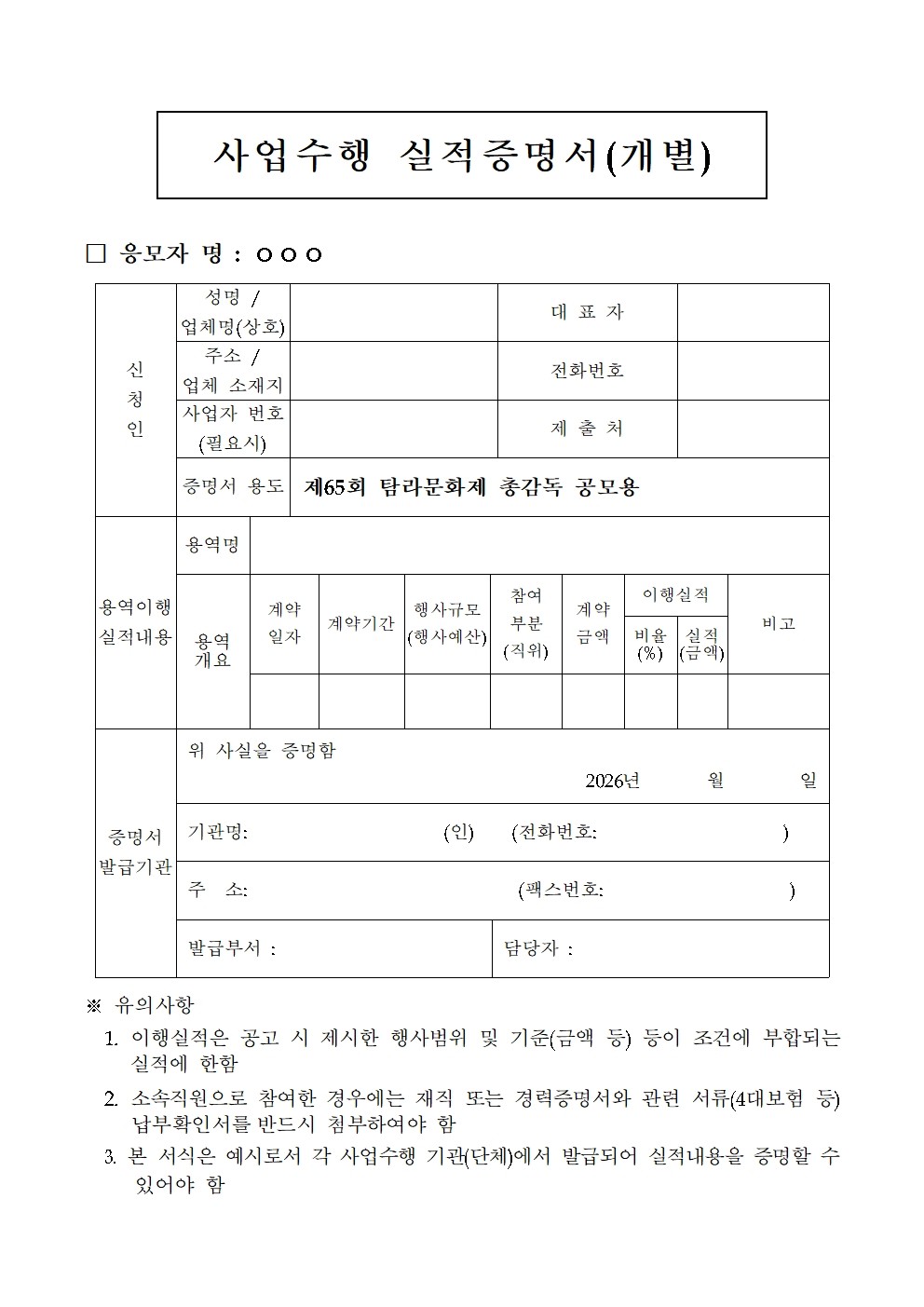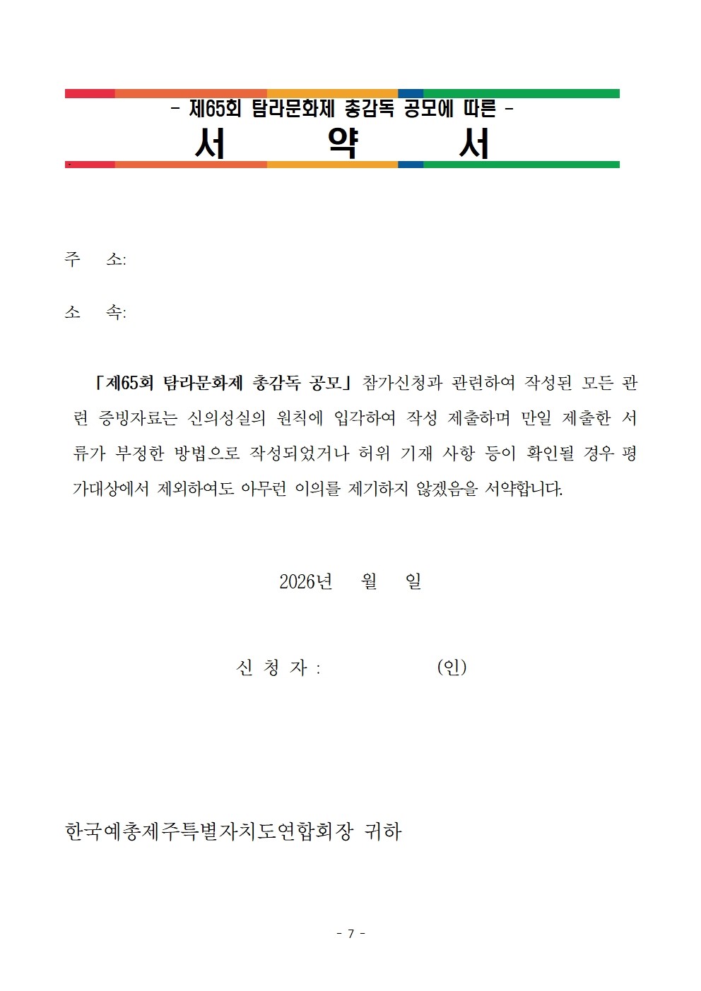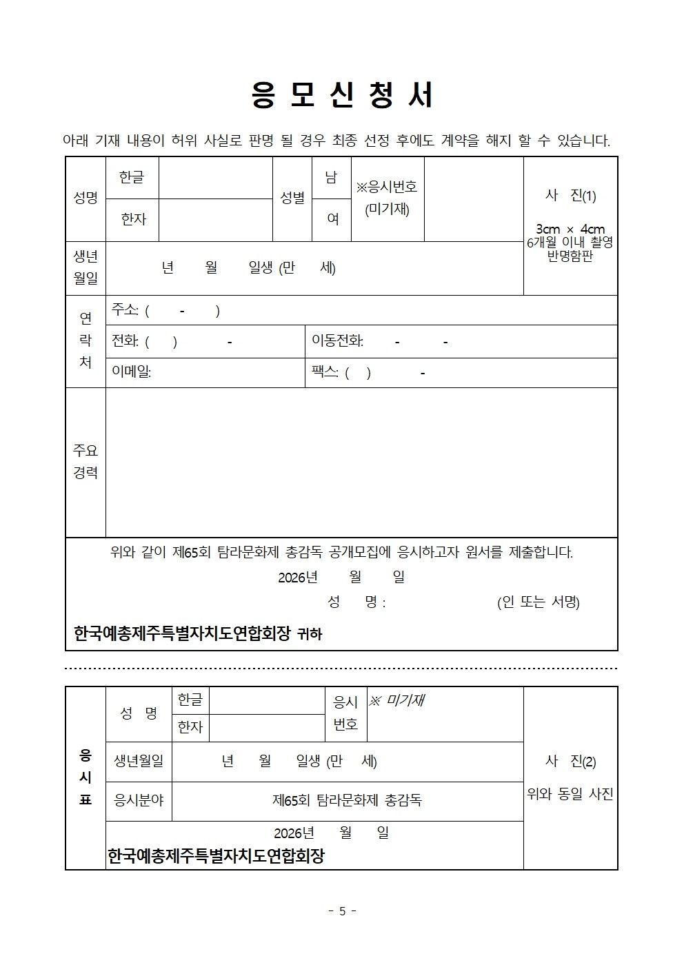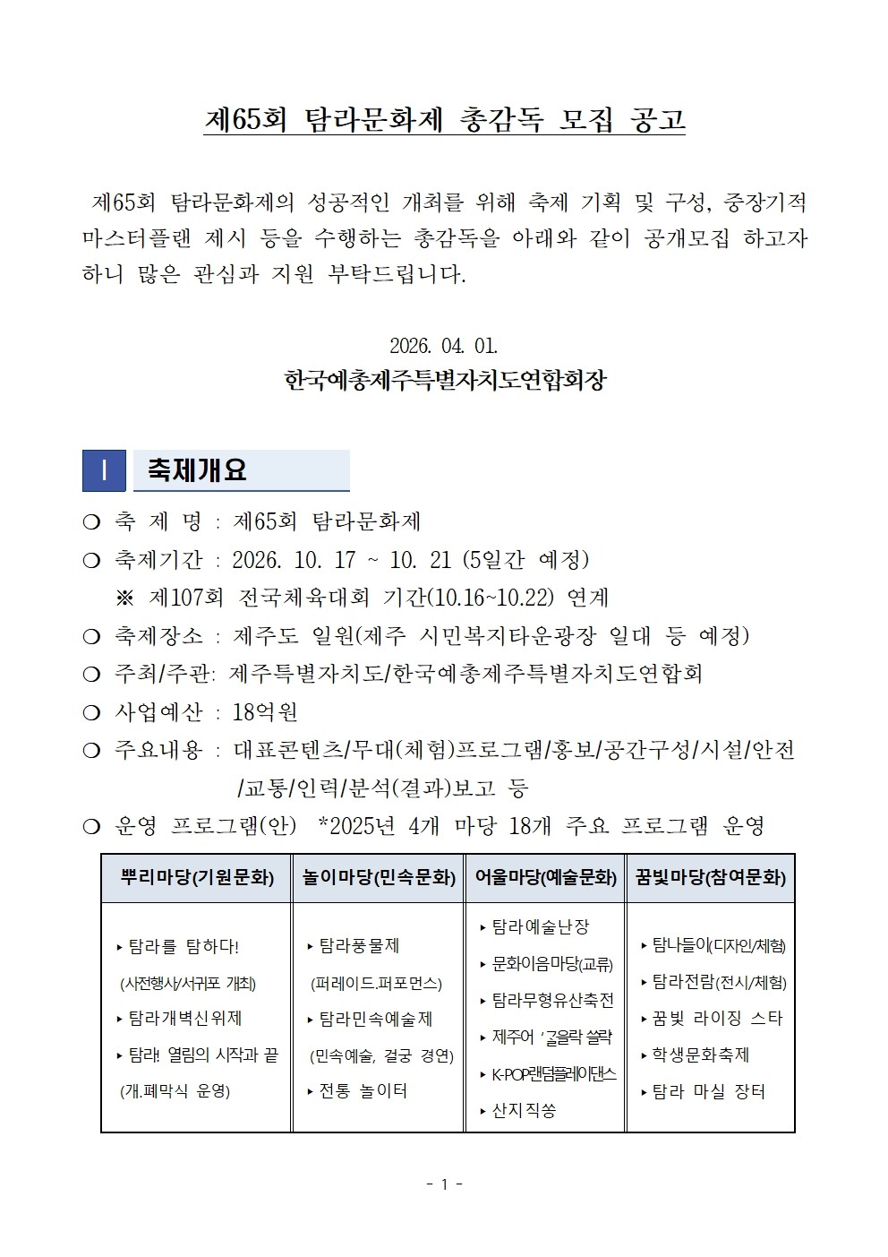공지사항 제주예총 활동 소식을 만나 보세요. 제65회 탐라문화제 총감독 모집 공고 2026-03-27 08:42:15 작성자관리자 (manager) IP : 61.85.2.110 조회수73 +파일첨부 파일등록 업로드 용량은 최대 5M입니다. 파일선택 비밀번호 취소 닫기 첨부파일(1) 파일 로딩중 Facebook Twitter Kakaostory google 프린터 목록 수정 삭제 게시물삭제 삭제하신 데이터는 복구가 불가능합니다. 게시물 제65회 탐라문화제 총감독 모집 공고 비밀번호 취소 닫기