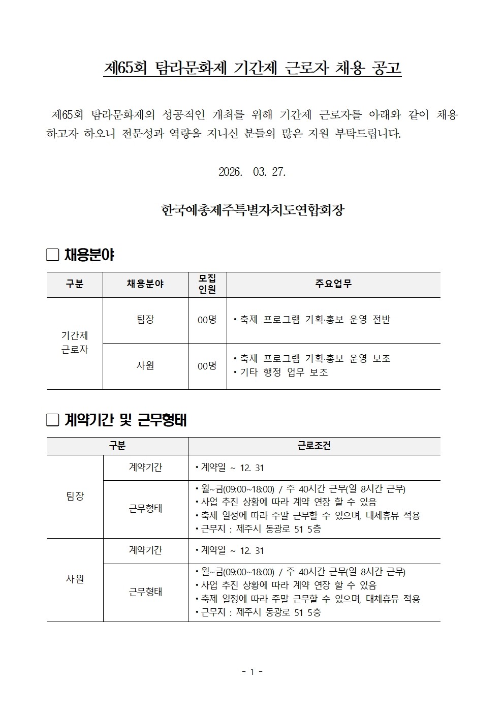 공지사항 제주예총 활동 소식을 만나 보세요. 제65회 탐라문화제 기간제 근로자 채용 공고 2026-03-27 08:43:53 작성자관리자 (manager) IP : 61.85.2.110 조회수124 +파일첨부 파일등록 업로드 용량은 최대 5M입니다. 파일선택 비밀번호 취소 닫기 첨부파일(1) 파일 로딩중 Facebook Twitter Kakaostory google 프린터 목록 수정 삭제 게시물삭제 삭제하신 데이터는 복구가 불가능합니다. 게시물 제65회 탐라문화제 기간제 근로자 채용 공고 비밀번호 취소 닫기