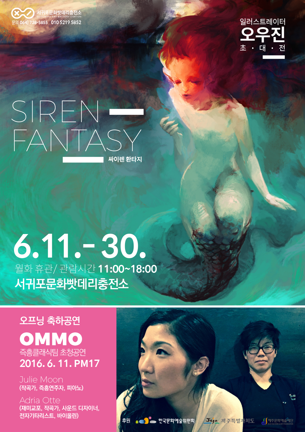 영화 “괴물” 캐릭터를 디자인한 제주 출신의 일러스트 작가 오우진이 고향 제주에서 처음으로 개인전을 엽니다. 오는 6월 11일부터 30일까지 서귀포의 복합문화공간 서귀포문화빳데리충전소에서 “싸이렌 환타지”를 테마로 그의 디지털 페인팅 작품을 선보일 예정입니다! 이번 기회에 전설 속 신비한 매력의 사이렌을 더욱 가까이 만나보는 건 어떠실런지요?